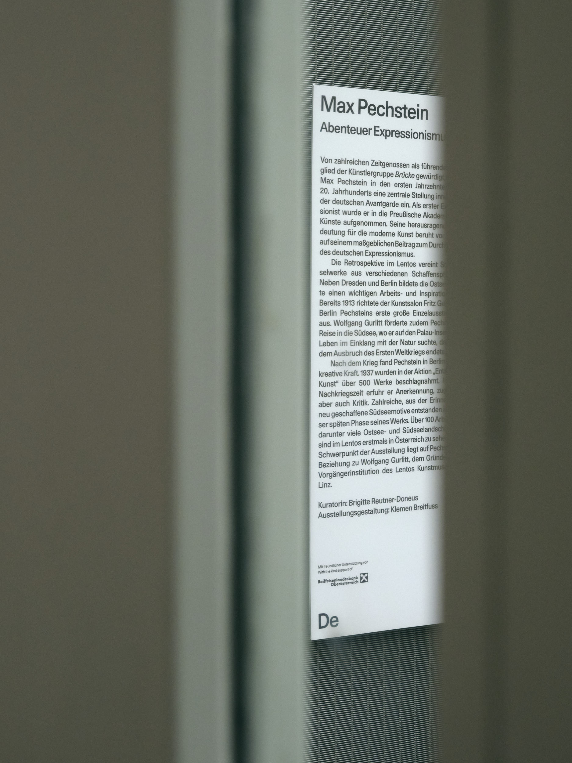Die Retrospektive im Lentos vereint Schlüsselwerke aus verschiedenen Schaffensphasen. Neben Dresden und Berlin bildete die Ostseeküste einen wichtigen Arbeits- und Inspirationsort. Bereits 1913 richtete der Kunstsalon Fritz Gurlitt in Berlin Pechsteins erste große Einzelausstellung aus. Wolfgang Gurlitt förderte zudem Pechsteins Reise in die Südsee, wo er auf den Palau-Inseln ein Leben im Einklang mit der Natur suchte, das mit dem Ausbruch des Ersten Weltkriegs endete.
